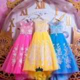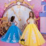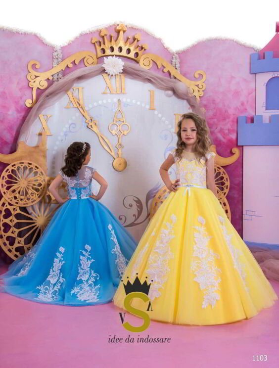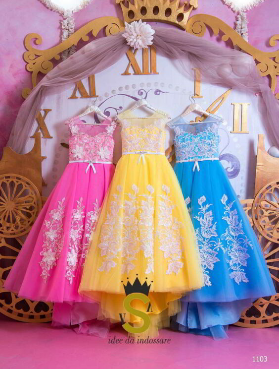 Principesco abito in tulle e ricco pizzo sul corpino e lungo la gonna.Ideale per damigelle,festa di compleanno,prima comunione o qualsiasi altra occasione,dove la vostra bambina si sentirà una vera principessa.