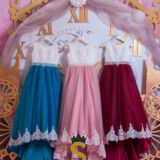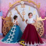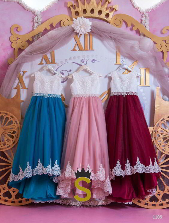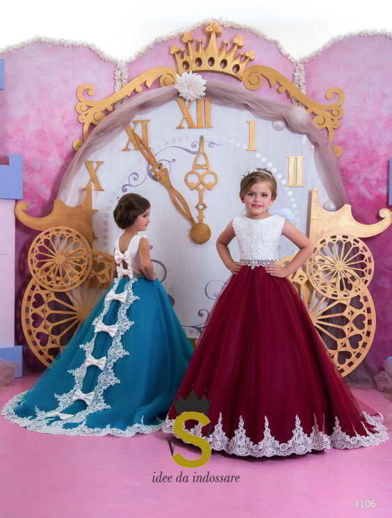 Principesco abito in tulle e ricco pizzo sul corpino e lungo la gonna.Dietro dolci fiochi sul corpetto e lungo la gonna.Ideale per damigelle,festa di compleanno,prima comunione o qualsiasi altra occasione,dove la vostra bambina si sentirà una vera principessa.