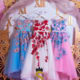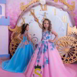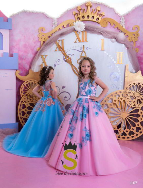 Principesco abito in tulle e ricco pizzo floreale sul corpino e lungo la gonna.Ideale per damigelle,festa di compleanno,prima comunione o qualsiasi altra occasione,dove la vostra bambina si sentirà una vera principessa.