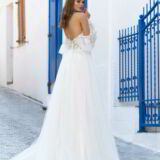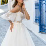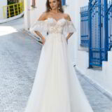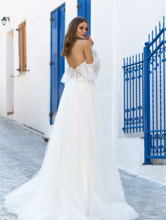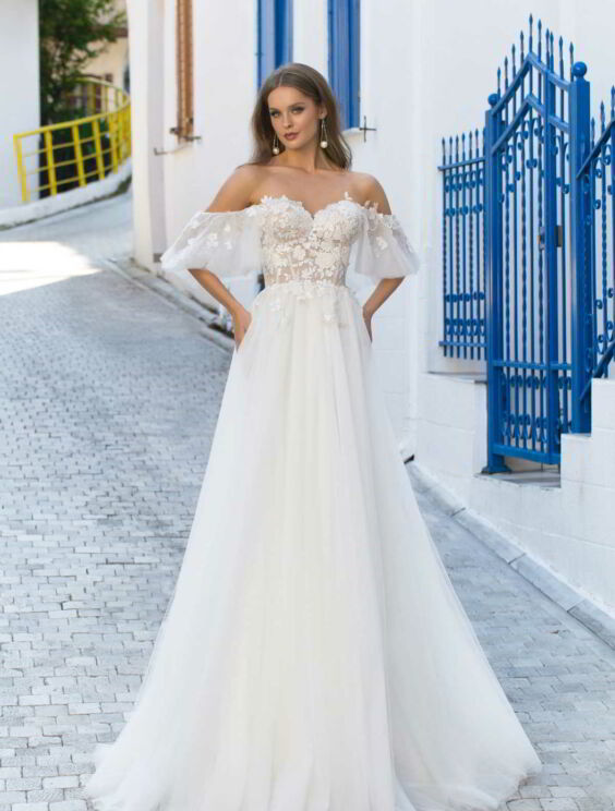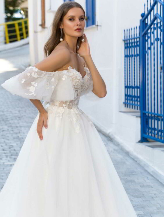 abito con corpetto a cuore.Favoloso vestito con corpetto a cuore ,ben strutturato pizzo floreale ricamato con perline.Manichetta sensuale,gonna morbida e leggera con strascico.