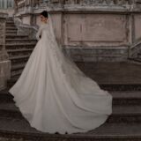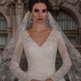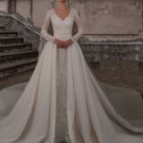 Abito da sposa stile sirena ,con pizzo e tulle glitter ricamatissimo di perline e cristalli.Gonna con strascico rimovibile in glitter,coperta di pregiatissimo pizzo. .Ideale per chi nel giorno del suo matrimonio vuole indossare un abito indimenticabile.