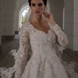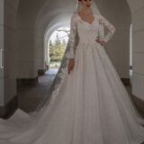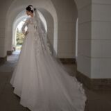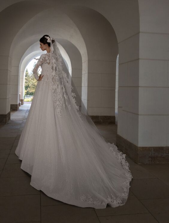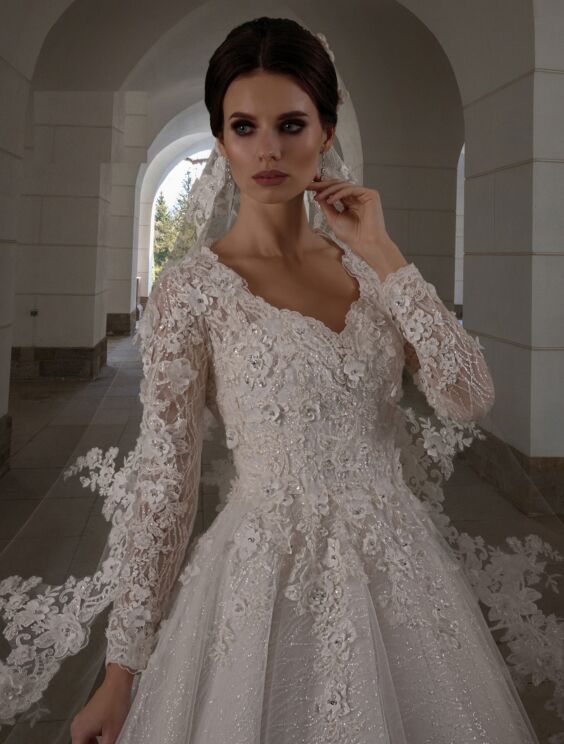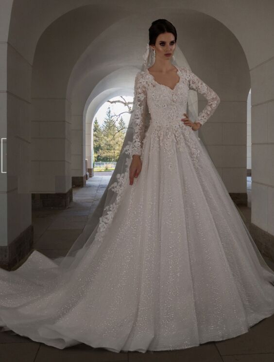 Elegante e principesco abito da sposa ,morbido con tessuti pregiati in glitter.Gonna ampia con strascico.L'abito e completamente in glitter , che rendono l'abito unico ,lussuoso e indimenticabile.Ideale per chi vuole indossare un abito diverso.