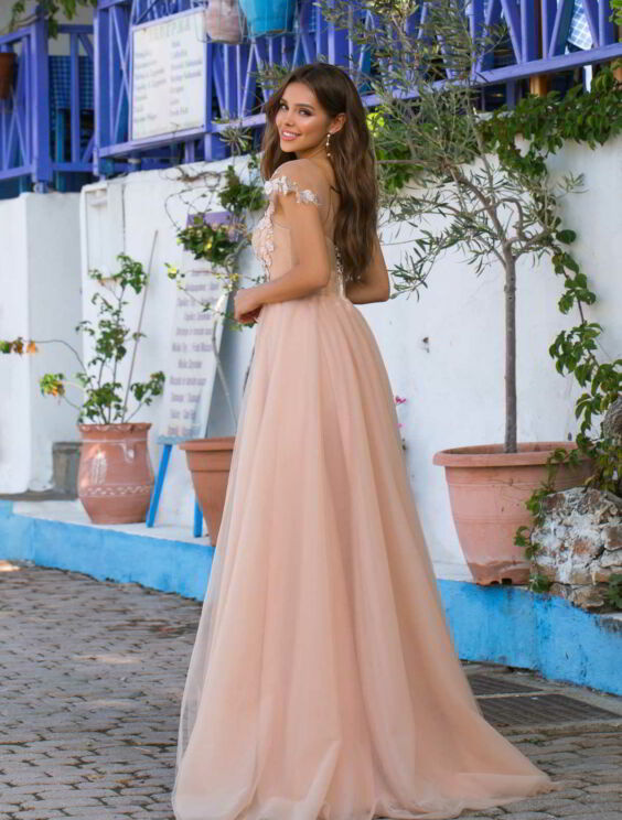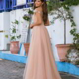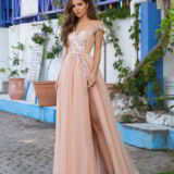 abito da sposa alternativo.Elegante e sensuale vestito color capuccino con spacco laterale,corpetto ben strutturato con coppe integrate.Ricamo floreale,