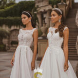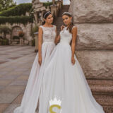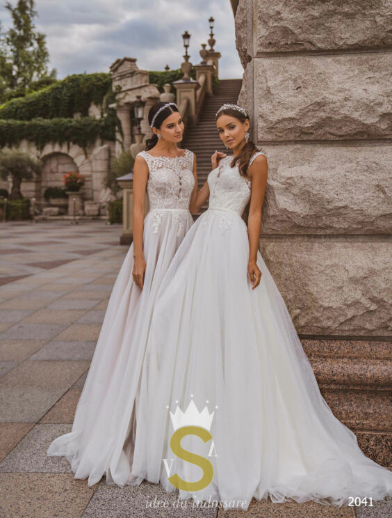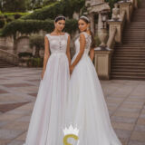 Abito da sposa elegante e economico.Corpino a cuore con pizzo e manichetta corta.Morbida e leggera gonna con leggero strascico.La schiena e coperta di pizzo con la fila di eleganti bottoncini.Il corpetto basso con chiusura a lacci invisibili.Un abito elegante,morbido,semplice ed economico,ideale per tutte le stagioni e per curve morbide.