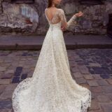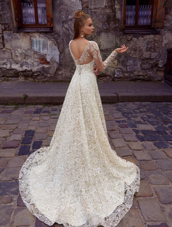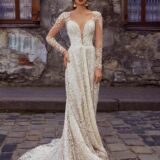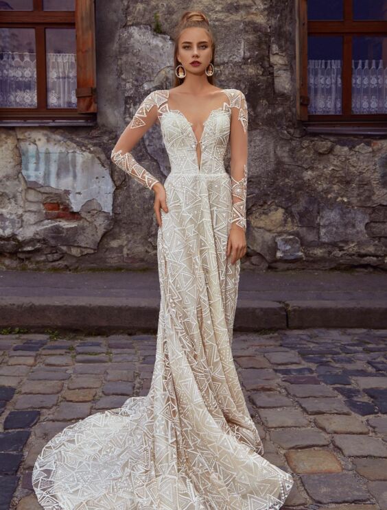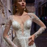 abito da sposa fantasia glitter.Elegante e raffinato abito da sposa,con tulle fantasie glitter.Manica lunga.Gonna taglio morbido con strascico.Elegante lavorazione nella scollatura profonda tuttavia coperta con tulle neutro color pelle.