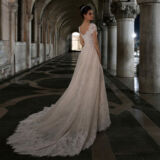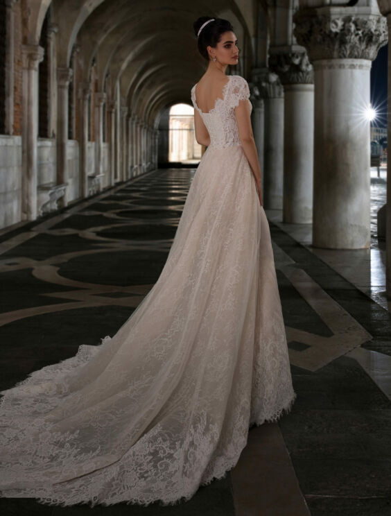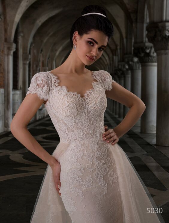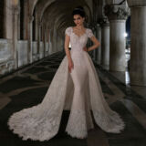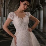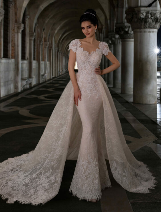 Elegante e particolarissimo abito in stile sirena ,morbido con tessuti pregiati pizzo chantilly. Gonna morbida cadente con strascico rimovibile che rendono l'abito unico e indimenticabile. .Ideale per chi vuole indossare un abito diverso.