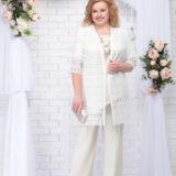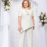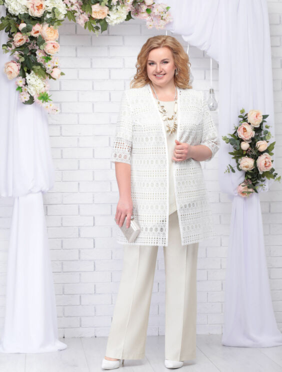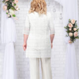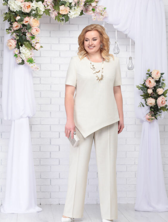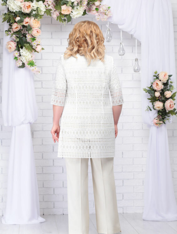 Elegantissimo completo in misto lino,colore beige,formato da camicetta a manica corta,con taglio particolare,pantalone e casacca in pizzo macramè. Ideale per qualsiasi occasione.
