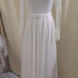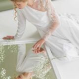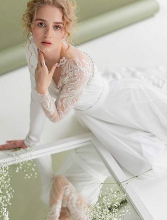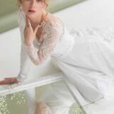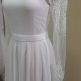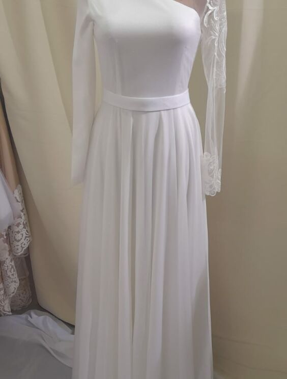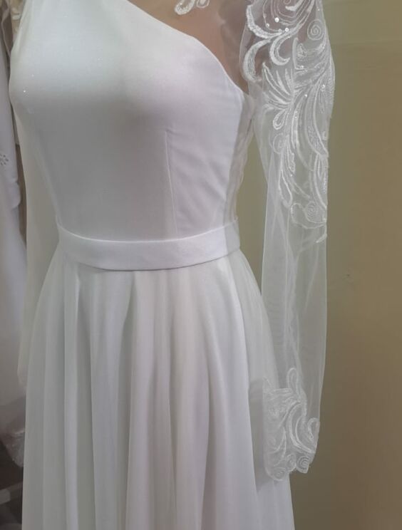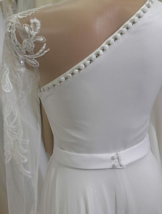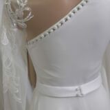 elegante abito da sposa in lurex luminoso con particolare spala diagonale