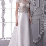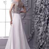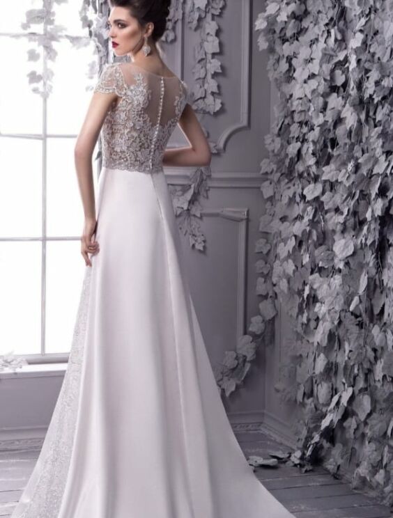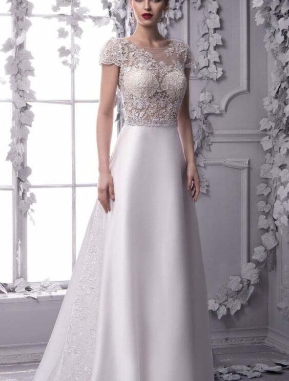 elegante vestito in raso di seta con ricami in macramè e inserti