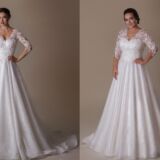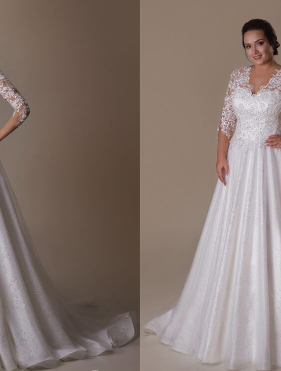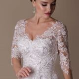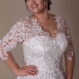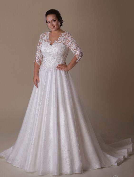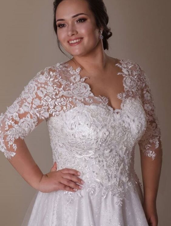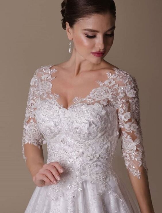 ricamatissimo abito da sposa.Magnifico abito da sposa ,elegante scollo a V,del taglio A-line,senza pieghe in vita,ideale per morbide curve.Manica lunga,pizzo ricamato,ideale per spose brillanti,scintillanti.Corpetto con lacci per miglior sostegno e vestibilità.Modello perfetto per qualsiasi struttura del corpo.