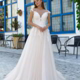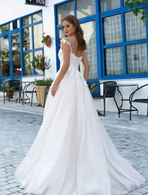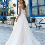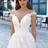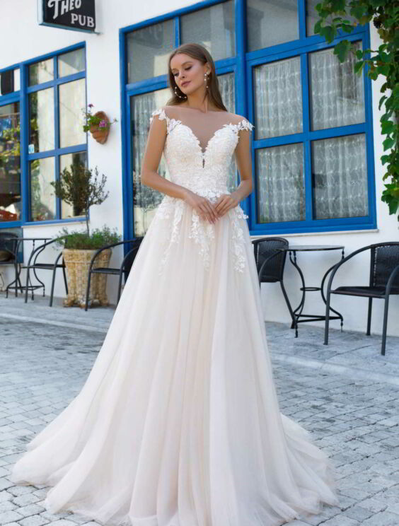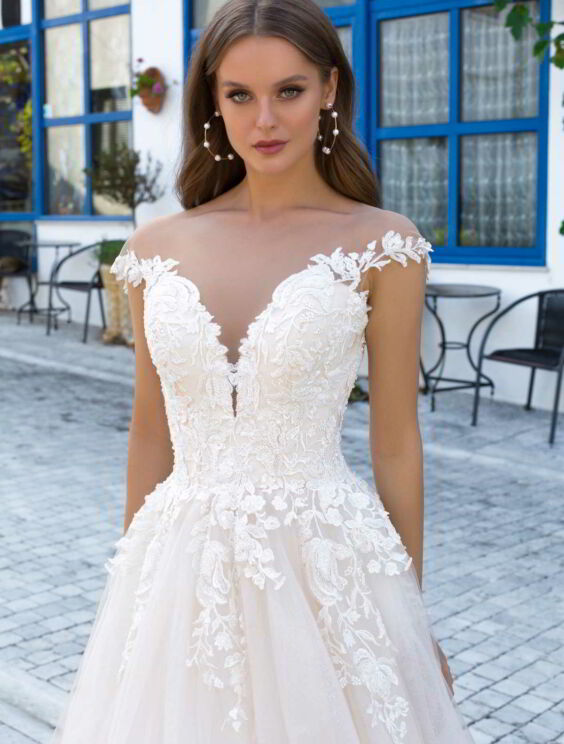 Stupendo abito da sposa ricamato.Meraviglioso abito con corpetto a cuore e pizzo ricamato.Stile A-line,veste e snellisce perfettamente la vita.Gonna con tulle glitter color cipria,leggero strascico.