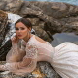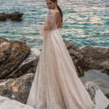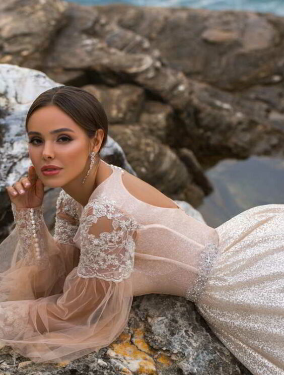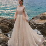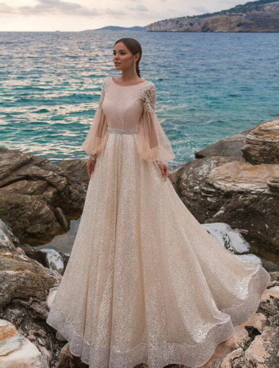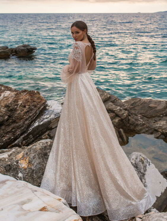 vestito da sposa in glitter ,elegante e raffinato .Corpetto ben strutturato,con scollatura chiusa,dietro scollo a forma di cuore.Morbida gonna in glitter.Particolare manica ricamata.
